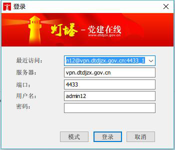 VPN客户端登录确保电脑可以正常访问互联网,双击“灯塔-党建在线VPN客户端”图标,客户端成功启动后,出现如图3所示界面,图中服务器地址、访问端口已经进行默认配置,用户只需输入“用户名”“密码”登录即可。