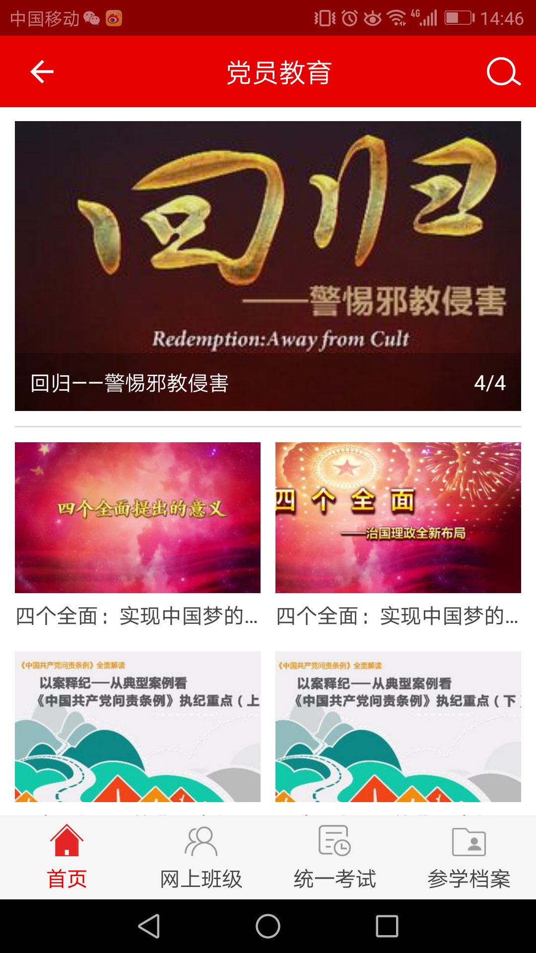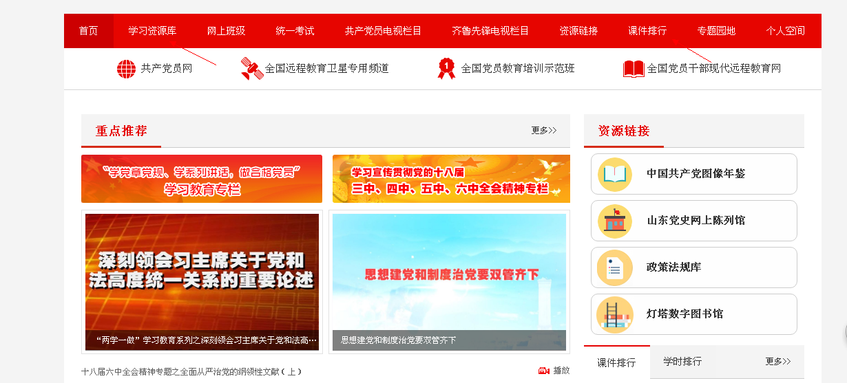 3、登录后,点击“党员教育网”,通过“首页”、“学习资源库”、“课件排行”等专栏,选择课件进行学习。