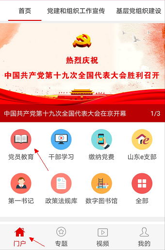 2、进入界面后,点击左下角“门口”,再点击“党员教育”,进入党员学习界面,选择想要学习的课件。